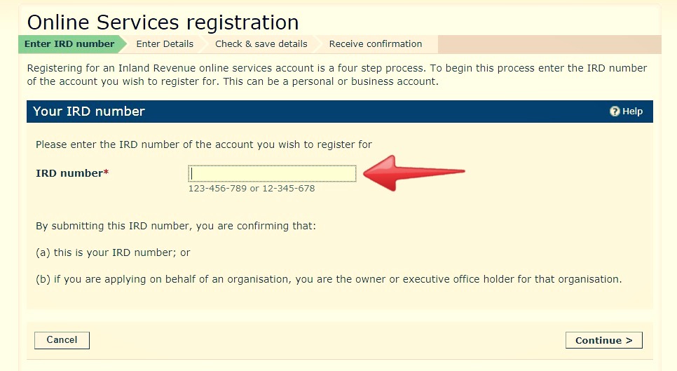 4. 사업체 IRD 번호를 입력하신 뒤 'Continue' 를 클릭하세요.